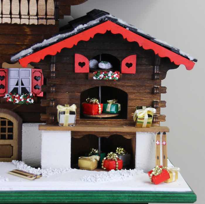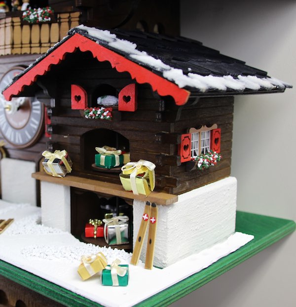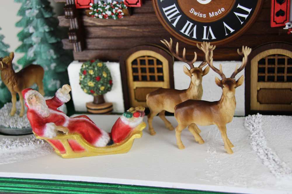 우리는 따끈한 뮬드 와인 한잔, 눈부시도록 반짝이는 눈가루, 보기만 해도 신이 나는 창문의 장식들, 집안 전체를 은은하게 채운 방금 자른 소나무 향과 퐁뒤 요리의 냄새와 같이 겨울이 우리에게 주는 즐거움에 영감을 받아 당사 최초로 산타클로스 헌정 작품을 만들게 되었습니다. Loetscher는 눈밭 위의 멋진 풍경을 가진 스위스 전통 샬레 뻐꾸기시계에 큰 자부심을 가지고 있습니다. 이 아름다원 뻐꾸기시계의 스테이지 중앙에서는 모든 사람들이 좋아하는 산타클로스가 크리스마스 선물이 가득 가득 담긴 썰매를 끌고 있습니다. 산타의 전용 순록들은 전 세계의 어린이들이 꿈꾸고 있는 선물을 어서 빨리 배달하고픈 마음으로 산타의 출발 신호를 기다리고 있습니다. 그리고 오른쪽으로 조금 떨어진 곳에는 산타의 선물 중 몇 개를 볼 수 있는 3개의 회전판을 가진 작고 매력적인 통나무집이 있습니다. 그 선물들은 모두 작은 고급 종이를 이용해 상당한 공을 들이는 수작업으로 만들어졌습니다. 스위스제 면을 이용해 직접 뜨개질하고 속에는 브리엔즈 호수의 모래가 채워진 두 개의 가방이 이 작은 오두막의 가장 위층을 장식하고 있습니다. 스테이지 왼쪽에는 눈으로 덮인 큰 소나무 3개가 이 독특한 산타 샬레의 옆쪽을 장식하고 있습니다. 그리고 그 옆에는 이동 플랫폼에 조심스럽게 발을 올려놓고 있는 귀여운 아기 순록이 있고 늠름하게 서 있는 큰 수컷 순록이 자신의 소중한 새끼를 보호해주고 있습니다.