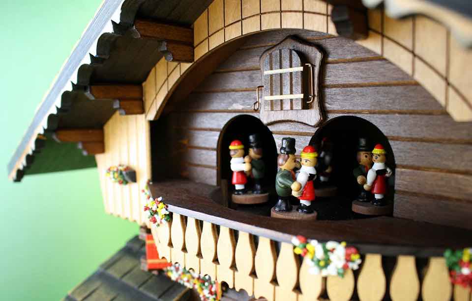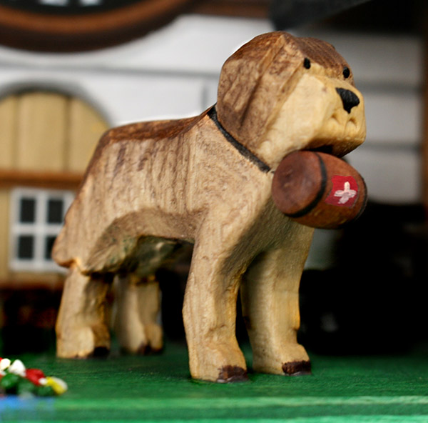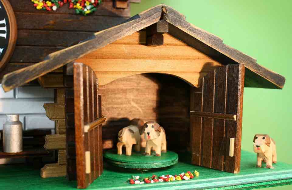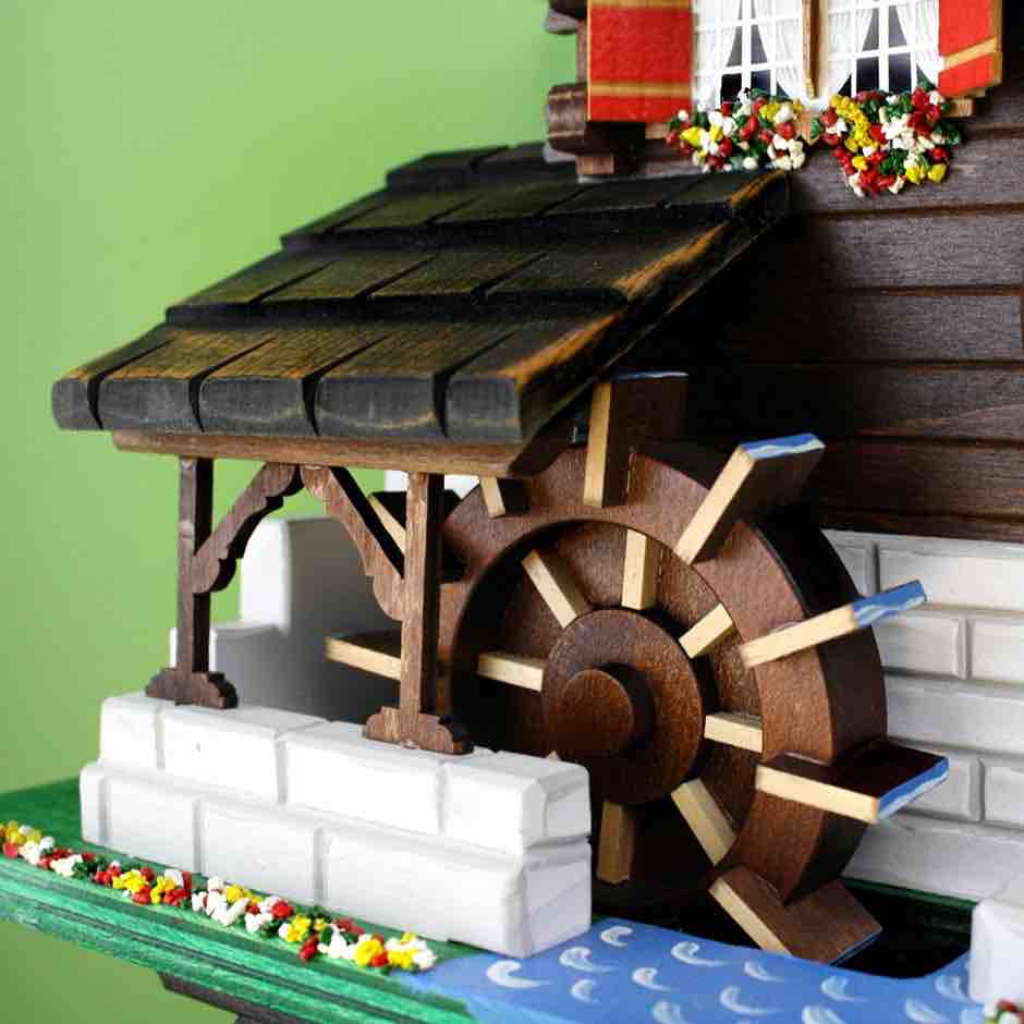 이 멋진 샬레 뻐꾸기시계의 중아에는 성 버나드 품종의 배리가 자리잡고 있습니다. 그리고 오른쪽을 보면 작고 아늑한 오두막에서 배리의 새끼강아지 두 마리가 놀고 있고 세 번째 강아지는 수줍은 듯 밖에서 안을 들여다보고 있습니다. 음악이 시간을 알려주면 오두막 안의 턴테이블이 회전하면서 마치 강아지들이 서로를 쫓고 있는 듯한 장면이 연출됩니다. 이 샬레의 가장 두드러진 특징은 한 조각의 나무를 깎아 만든 브리엔즈 스타일의 지붕입니다. 그리고 왼쪽의 특별히 크게 만들어진 물레바퀴가 음악에 따라 움직이면 마치 흐르는 물의 힘으로 회전하는 듯 보입니다. 우리의 성실한 뻐꾸기가 정시가 되었음을 알려주면 신나는 두 곡의 음악이 번갈아 연주되고 스위스 전통 복장을 한 발코니의 네 쌍의 커플들이 행복의 춤을 추기 시작합니다. 마지막으로 그리고 우리의 Loetscher 시계 모두가 그렇듯이 스테이지 전체를 화려하게 꾸며주는 돌과 화려한 색의 꽃들은 모두 브리엔즈 호수 기슭의 모래들을 이용해 수작업으로 만들어집니다.