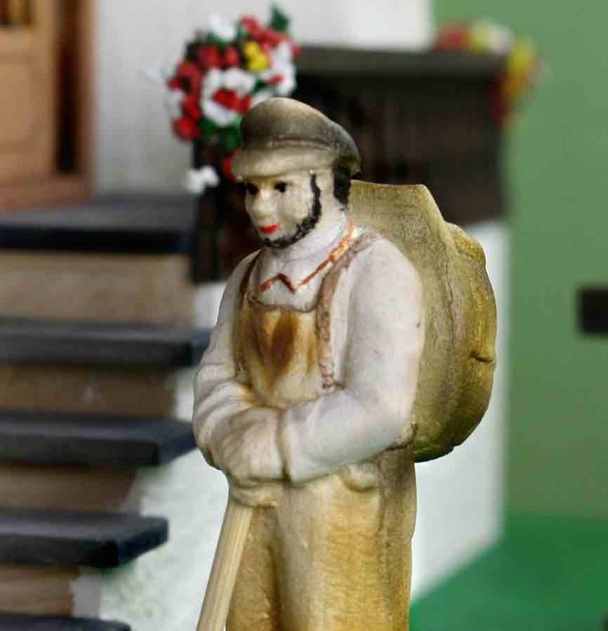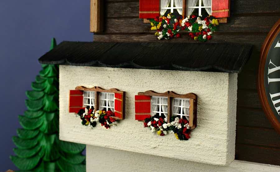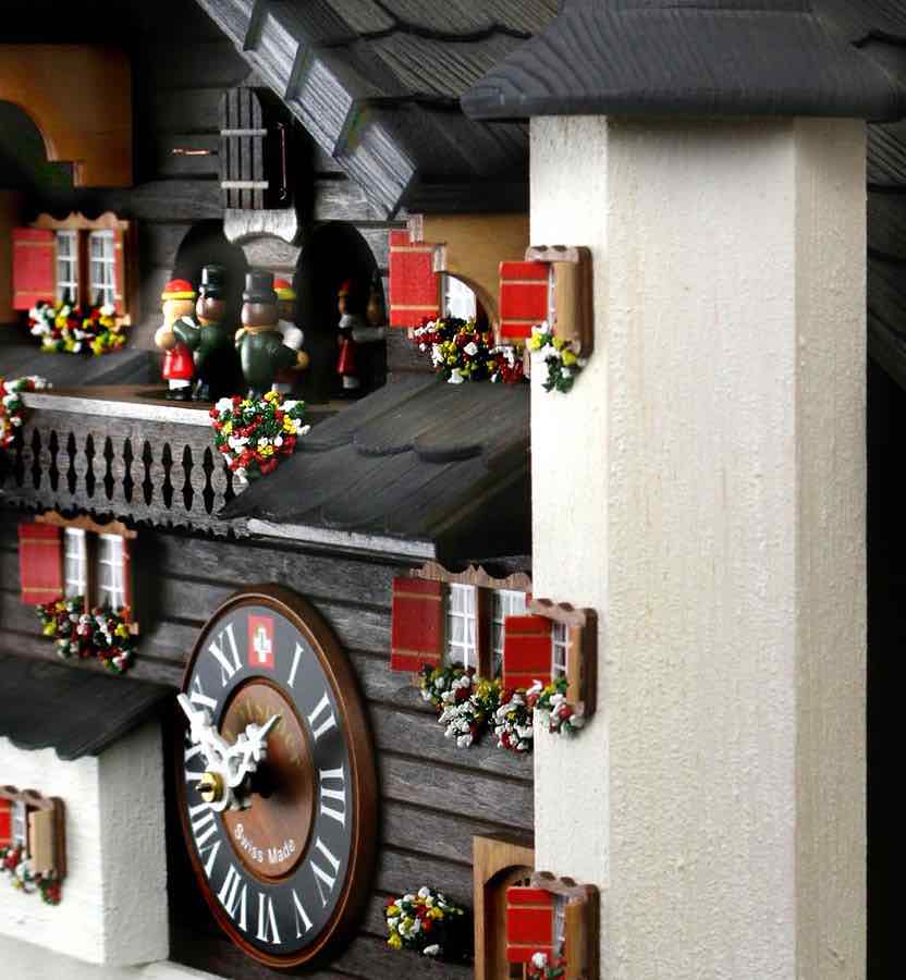 와인메이커 모델은 다음과 같은 두 가지 이유로 Loetscher 컬렉션 중에서도 가장 뛰어난 작품입니다. 첫째, 이 샬레 뻐꾸기시계는 Appenzel주의 기존 건물을 모델로 했습니다. 이 작품을 특별하게 해 주는 것 중 하나는 샬레 오른쪽에 위치한 눈에 띄는 흰 색의 탑입니다. 탑의 전면에 위치한 3개의 창은 형형색색의 꽃이 넘쳐나는 꽃상자로 장식되어 있고 밝은 붉은색의 덧문이 달려 있어서 그렇지 않아도 눈에 띄는 광경을 더욱 아름답게 만들어주고 있습니다. 이 모델을 그토록 뛰어나도록 만드는 또 하나의 특징은 스위스 와인메이커들에게 보내는 존경입니다. 스테이지 가운데에는 방금 수확한 포도를 나르고 있는 와인메이커 그리고 풀밭 위에서 일광욕을 하고 있는 순백색의 우아한 오리 두 마리를 볼 수 있습니다. 와인메이커 뒤의 오른쪽에는 전통적인 와인 기계가 놓여 있습니다. 스테이지 왼쪽에는 성 버나드 품종인 배리와 두 마리의 새끼들이 회전판 위에 서 있습니다. 정시가 되었음을 알려 주는 뻐꾸기 소리가 들리면 신나는 두 곡의 음악이 번갈아 연주되고 배리가 서 있는 회전판이 움직이고 발코니의 댄서들의 유쾌한 회전이 시작됩니다.