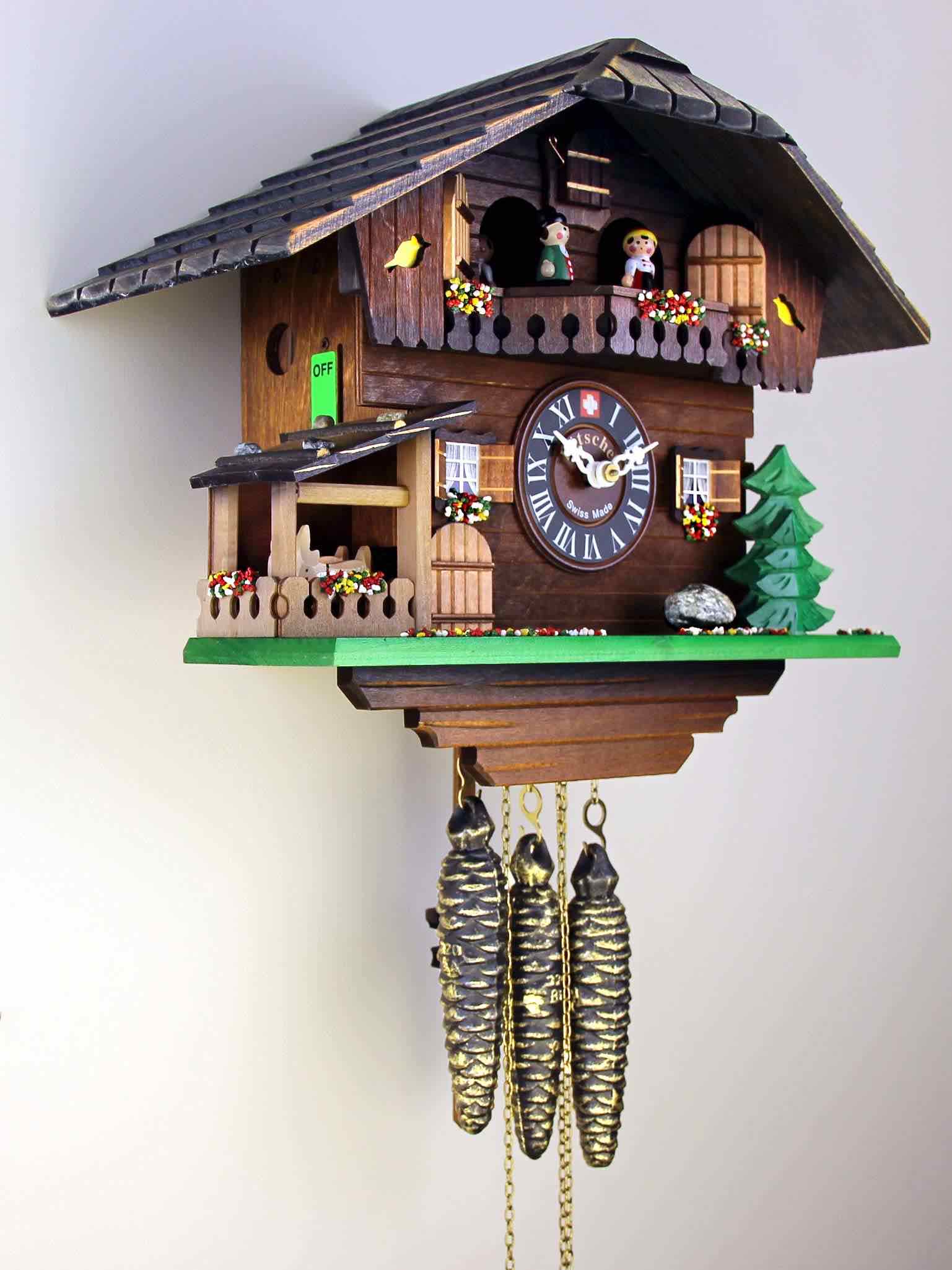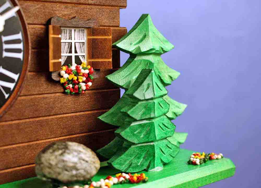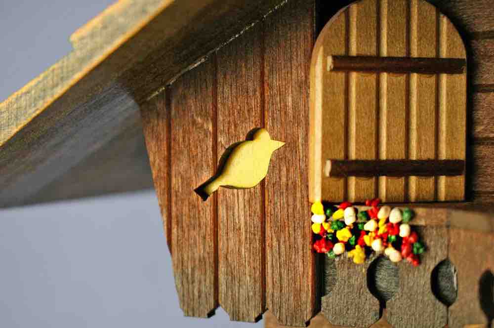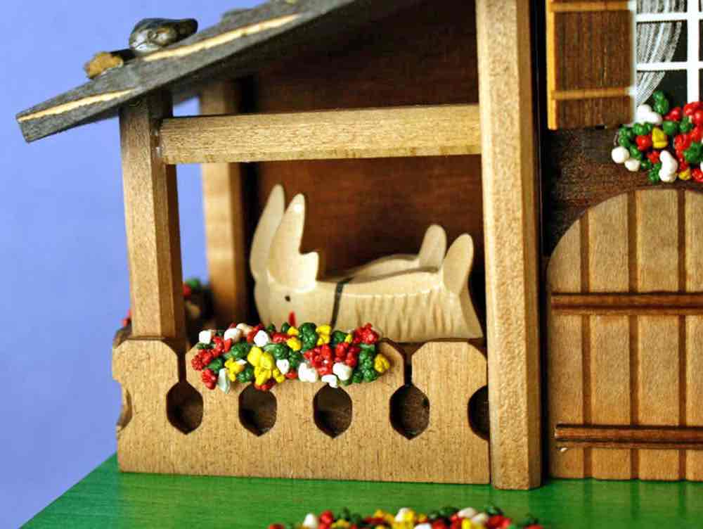 이 매혹적인 샬레 뻐꾸기시계의 이름은 샬레의 박공벽에 조각된 밝은 노란색의 방울새 두 마리로부터 왔습니다. 이 화려한 노란색은 박공벽의 짙은 갈색과 극적인 대비를 이룹니다. 왼쪽에는 호기심 많은 두 마리의 염소가 아늑한 마구간에 숨은 듯 들어가 있습니다. 30분 간격으로 음악이 연주되면 이 염소들이 위아래로 움직이면서 마치 춤을 추는 듯한 재미있는 장면을 연출하고 동시에 발코니의 조각품들이 원을 그리며 회전합니다. 그리고 우리의 Loetscher 시계 모두가 그렇듯이 스테이지 전체를 화려하게 꾸며주는 돌과 화려한 색의 꽃들은 모두 브리엔즈 호수 기슭의 모래들을 이용해 수작업으로 만들어집니다.