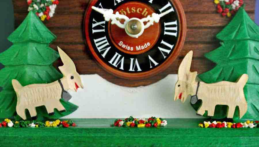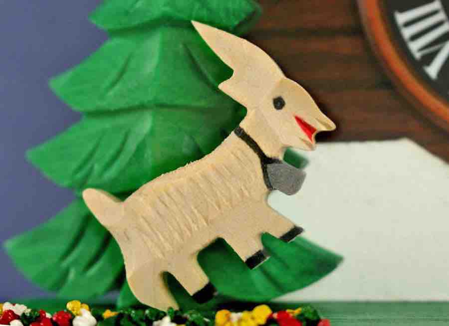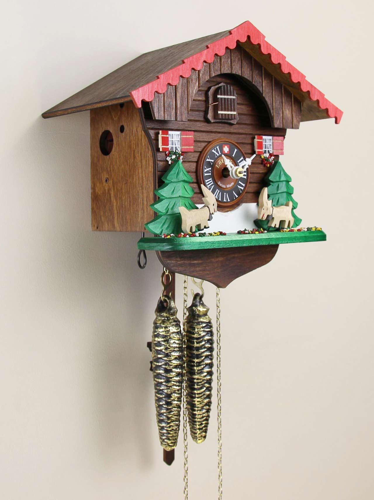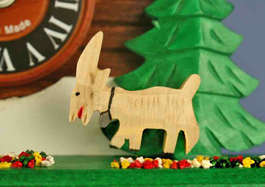 Loetscher의 뛰어노는 염소 샬레 뻐꾸기시계는 이 멋진 영혼의 동물에게 경의를 표합니다. 이 모델은 두 마리의 염소가 샬레의 양쪽에서 서로를 마주보고 서 있는 장면을 보여줍니다. 뻐꾸기 소리가 들리면 우리의 염소들은 공중으로 즐겁게 뛰어오릅니다. 양쪽의 염소 뒤로는 커다란 소나무가 있고 염소의 발굽 아래에는 브리엔즈 호숫가에서 수집한 돌로 만든 화려한 색상의 알프스 야생화들이 펼쳐져 있습니다. 샬레 덧문의 색은 위쪽의 처마와 조화를 위해 진한 적색을 입혔습니다.