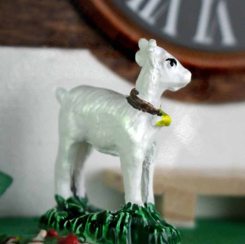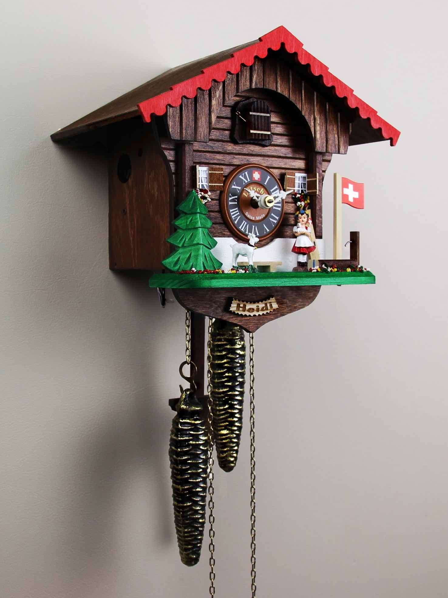 이 샬레 뻐꾸기시계의 주요 조각품은 귀여운 아기 염소를 안고 있는 우리의 사랑스러운 하이디입니다. 스테이지 한가운데의 어미 염소와 하이디가 아기 염소를 올려다보고 있습니다. 하이디 뒤에는 알프스 나무 스키 한 쌍이 있습니다. 스테이지의 제일 오른쪽에는 스위스 국기가 손으로 깎아 만든 나무 게양대 제일 위쪽에 매달려 산에서 불어오는 차가운 바람에 휘날리고 있고 그 옆에는 현지의 나뭇가지를 역시 손으로 깎아 만든 우물이 놓여 있습니다. 제일 왼쪽에는 풍성한 잎의 녹색 소나무가 있습니다. 브리엔즈 호숫가의 돌로 만든 꽃이 샬레 양쪽을 장식하고 있습니다. 짙은 갈색의 건물과 대조를 이루는 밝은 적색의 처마가 이 정교한 그림을 마지막으로 완성시켜 줍니다.