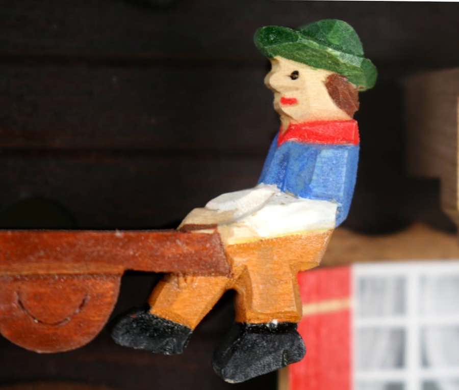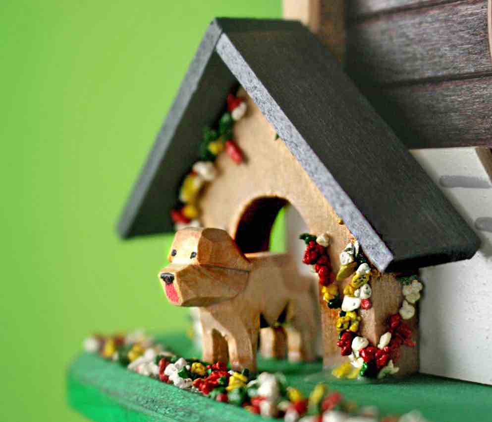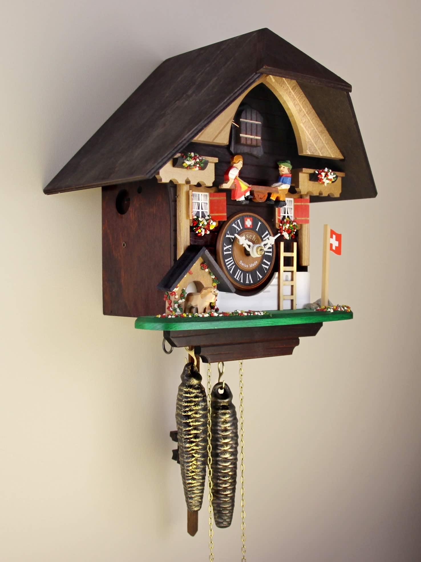 이 에멘탈 스타일의 샬레에는 중앙 시계 바로 위쪽에 시소가 있습니다. 시계의 짹깍이는 소리와 함께 이 시소는 위아래로 움직이면서 시계 전체에 활력을 가져다주고 있습니다. 왼쪽에는 아름다운 꽃으로 덮인 작은 개집이 있고 그 안에는 작은 개가 살고 있습니다. 깃대 아래쪽의 돌들은 브리엔즈 주변에서 수집해온 것들이며 꽃은 브리엔즈 호수에서 신중하게 고른 모래에 손으로 채색해 만들었습니다. 마지막으로, 뻐꾸기가 노래를 부를 때마다 굴뚝 청소부가 굴뚝 밖으로 머리를 내밉니다.