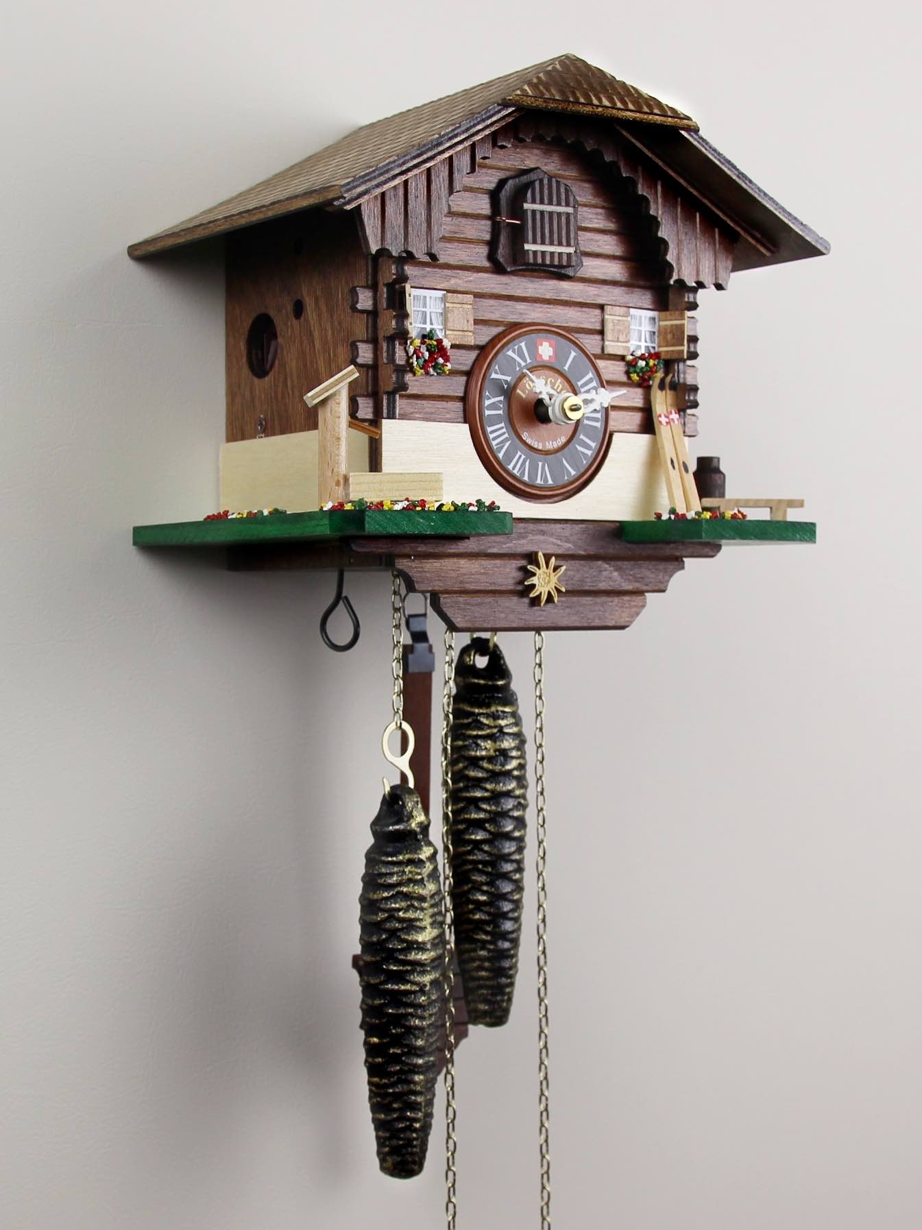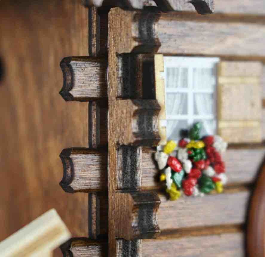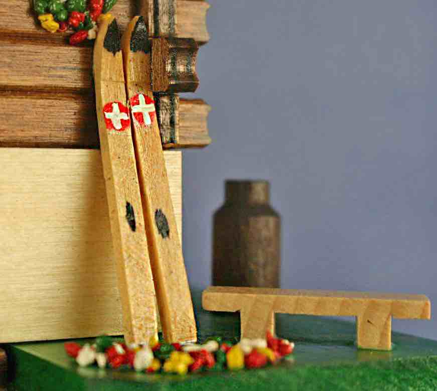 가루처럼 보이는 눈, 웅장한 산의 정상, 볼이 장밋빛이 된 채 스키를 타고 바람 소리를 내며 끝없는 경사를 따라 내려오는 사람들, 그리고 전통적인 스키 샬레를 빼놓고 스위스에 대해 말한다는 것은 불가능에 가깝다. 이 뻐꾸기시계에서 Loetscher는 스위스에서 오래 전부터 사랑받아온 스키와, 여러 세대를 거쳐 내려오는 스키에 대한 열정에 경의를 표합니다. 스위스인들은 자녀가 아주 어릴 때부터 산에서 스키 타는 법을 가르칩니다. 이 뻐꾸기시계는 스위스의 전통적인 산악 샬레를 묘사합니다. 오른쪽에는 샬레 앞쪽에 기대어 있는 스키 한 쌍이 있고 그 옆에는 두 개의 우유 깡통이 놓여 있습니다. 왼쪽에는 스위스의 산 그 중에서도 특히 브리엔즈 주변에서 흔히 볼 수 있는 우물이 있습니다.