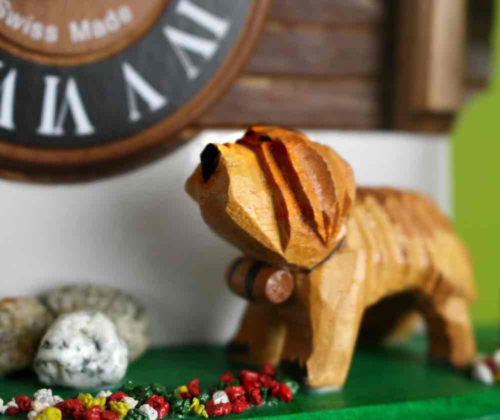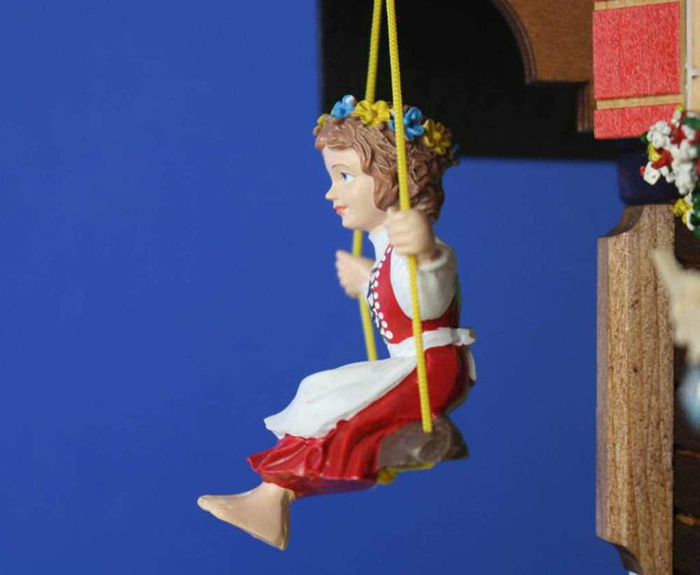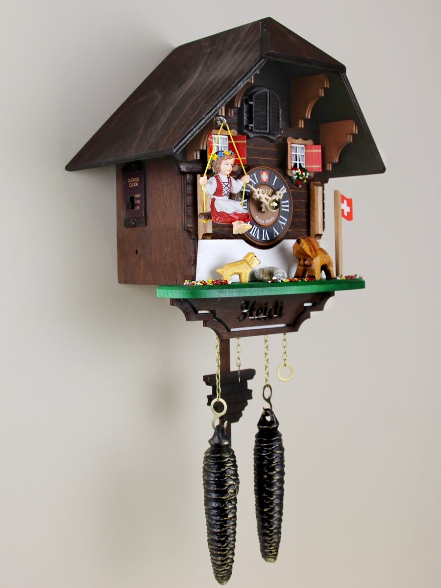 Loetscher는 스위스 문학 역사상 가장 사랑받는 캐릭터인 하이디를 여기에서 다시 한 번 재현하였습니다. 하이디는 이번에는 전통적인 에멘탈 스타일 샬레의 서까래에 매달린 그네에 앉아 있고 성 버나드 품종의 배리 그리고 아담한 크기의 새끼는 샬레 앞에서 보초를 서고 있습니다. 오른쪽에는 스위스 국기가 걸려 있는 나무 깃대가 있습니다. 물론 다른 Loetscher 샬레 뻐꾸기 시계와 마찬가지로 샬레 전체를 장식하고 있는 꽃과 돌들은 브리엔즈 호수의 모래를 이용해 만들어집니다.