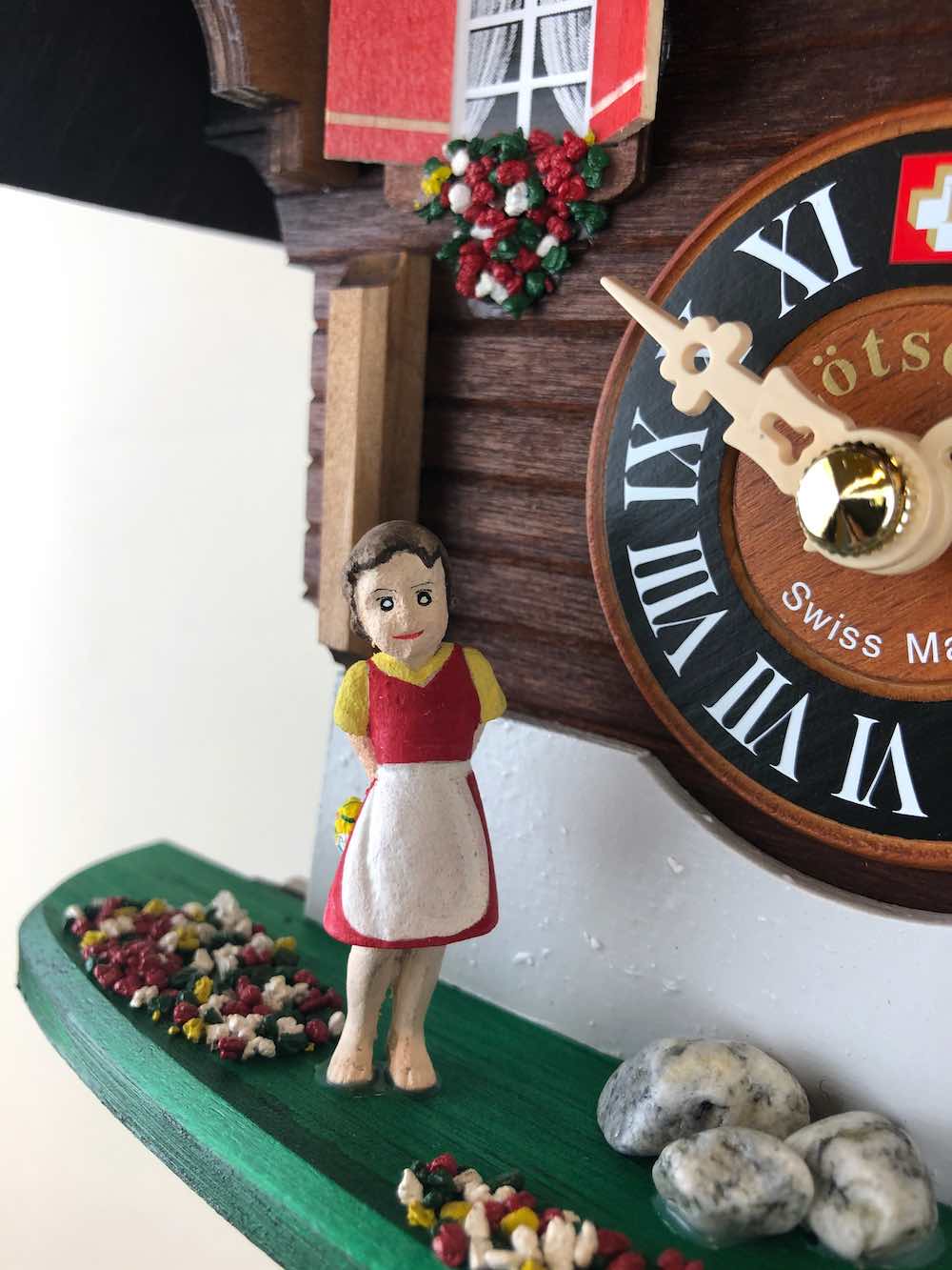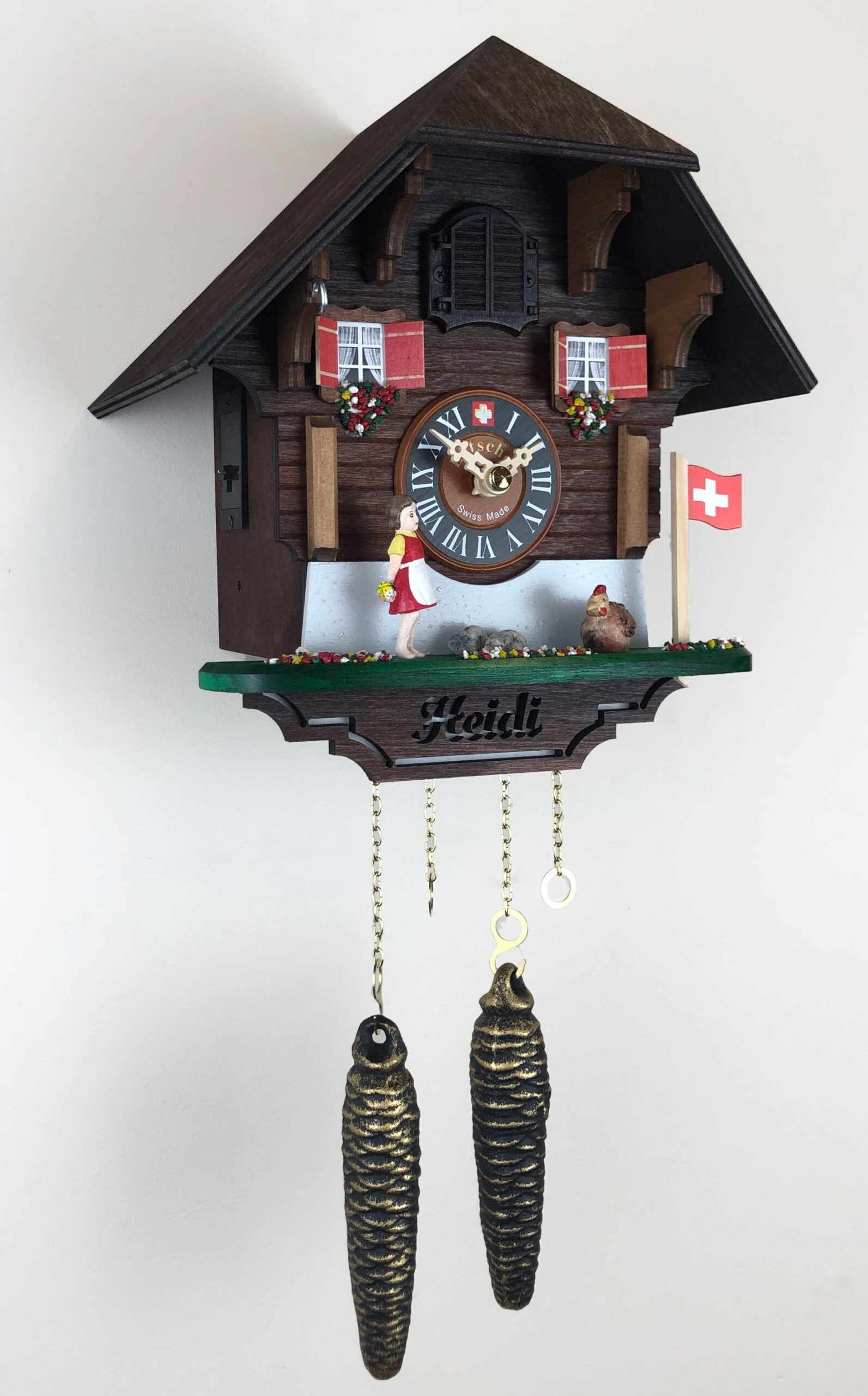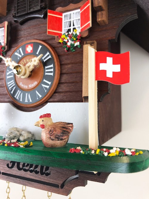Loetscher는 스위스 문학 역사상 가장 사랑받는 캐릭터인 하이디와 귀여운 닭을 재현하였습니다. 전통적인 에멘탈 스타일 샬레에서 하이디와 귀여운 닭이 서로를 바라보고 있습니다. 오른쪽에는 스위스 국기가 걸려 있는 나무 깃대가 있습니다. 물론 다른 Loetscher 샬레 뻐꾸기 시계와 마찬가지로 샬레 전체를 장식하고 있는 꽃과 돌들은 브리엔즈 호수의 모래를 이용해 만들어집니다.